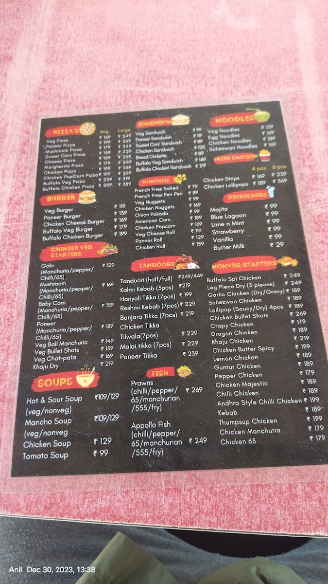 The Chinese Bowl category includes dishes like Gobi Manchuria, Chilli Gobi, Chicken Manchuria, Paneer Manchuria, Mushroom Manchuria, and Veg Noodles, providing a selection of Indo-Chinese flavors. Additionally, highlighted main dishes such as Garlic Chicken, Buffalo SPL Chicken Pizza, Cheese Pizza, Chicken Lollipop, Dum Biryani, and Burgers are also part of the menu, offering more substantial meal options.
