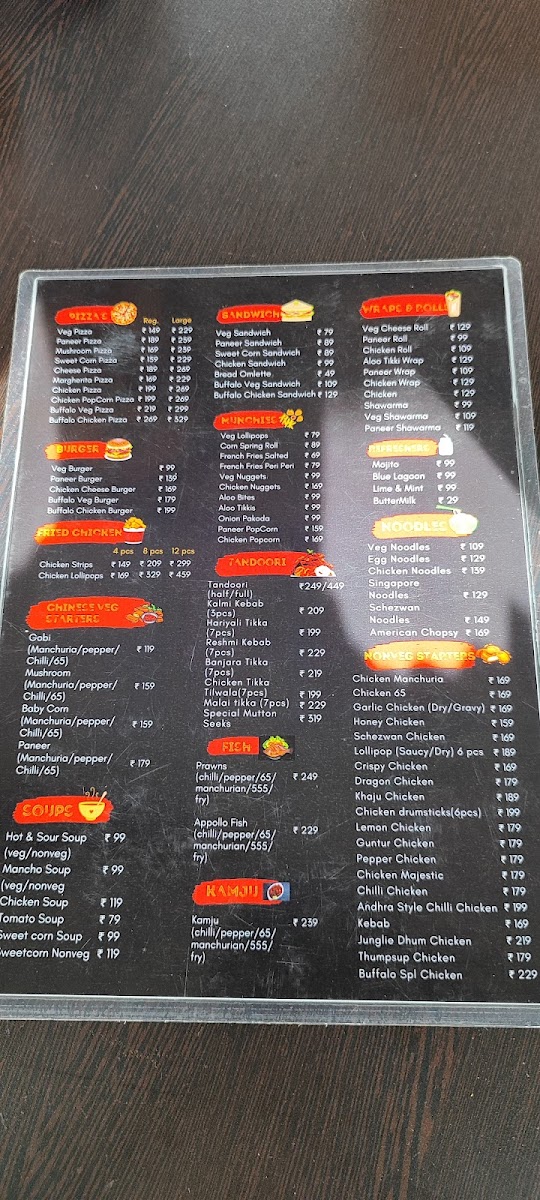The menu offers a variety of food items organized into several categories, catering to different meal preferences throughout the day. For light meals and snacks, there are options such as Shawarma available in Chicken, Veg, and Paneer varieties. The Momo's section features a range of steamed and fried dumplings with fillings including Veg, Paneer, Corn, Mushroom, and Chicken.